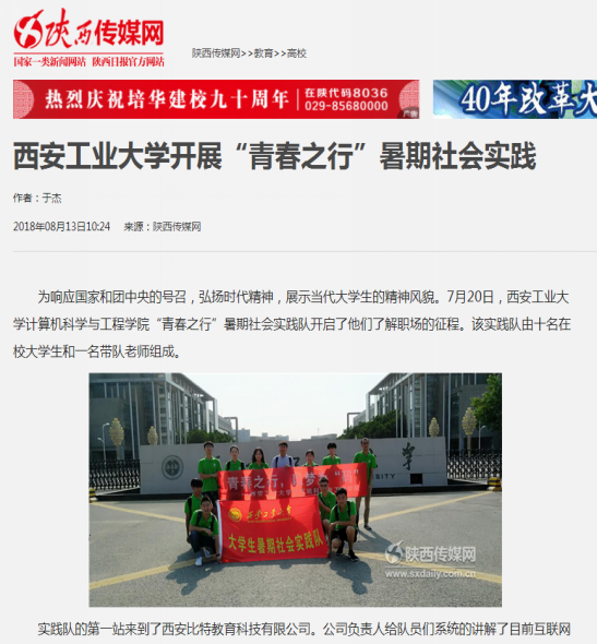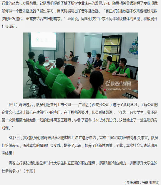 8月13日,陕西传媒网以《太阳成集团tyc33455cc开展“青春之行”暑期社会实践》为题,报道了公司太阳成集团tyc33455cc“青春之行”暑期社会实践队响应国家和团中央的号召,紧扣时代主题,围绕创新创业积极开展的实践活动。由来自公司计算机科学与技术等专业的10名优秀员工组建的实践队伍利用暑期在西安市进行了有关创新创业的社会实践活动,受到西安比特教育科技有限公司和西安广联达科技股份有限公司的好评,得到了媒体的关注。