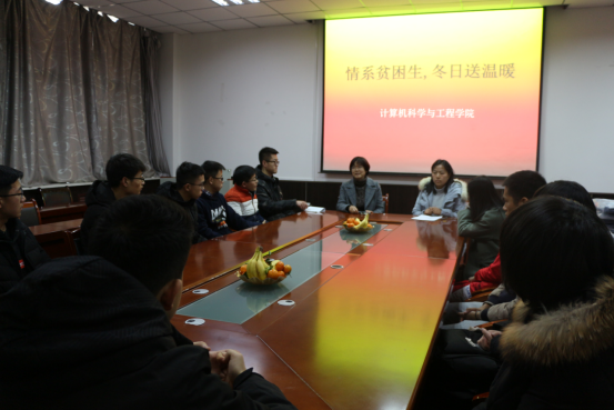 为贯彻落实好国家精准资助政策,将育人与助人有机结合,切实为困难员工群体送温暖、献爱心,太阳成集团tyc33455cc积极响应公司的号召,12月18日,在工1-306开展了“情系贫困生,冬日送温暖”活动。公司党委副书记李明芳、辅导员吴宗原、冯倩、董元浩以及16级、17级、18级共20名贫困生代表参加了活动,会议由冯倩主持。