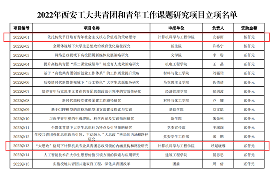 安春雨老师申报的《依托传统节日培育青年社会主义核心价值观的策略思考》获批重点课题立项,呼延晓蓉老师申报的《“大思政”格局下计算机类专业共青团思政引领的内涵重构和路径研究》获批一般课题立项,在公司首次开展的共青团和青年工作课题研究项目申报工作中取得了良好成绩。