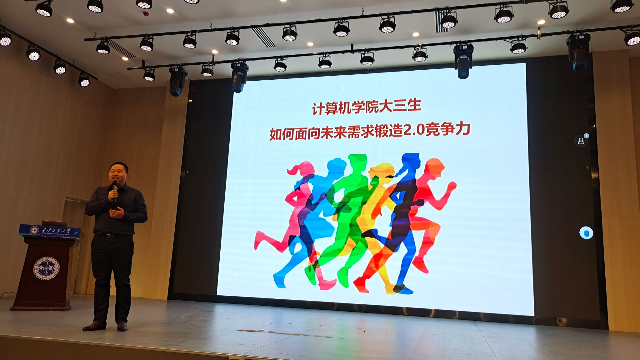 报告会上,蔡鹏表达了重返母校和公司的怀念与感谢之情,对母校师生良好的精神面貌感到振奋与骄傲。他通过扎实的专业知识,结合西安软件园的工作经历,深入解析了目前计算机行业的发展动态及就业前景。接着,蔡鹏围绕西安IT产业实时画像、西安IT人才圈层与链接、IT产业红利及人才红利变化、计算机专业老员工如何面向未来构建真实竞争力四个方面展开,分别回答了未来是什么?未来人才在做什么?未来人才需求是什么?今天我们怎么做?随后,蔡鹏与现场员工进行互动,问答了员工们关心的问题。他鼓励同学们要坚定信念,端正学习态度,认清自身能力,立足于计算机专业领域,只要能吃苦、肯钻研就能成功。