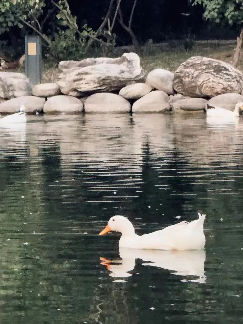 白凯毅同学拍摄的照片中,湖面上鸭子的倒影轻轻摇曳,如同一幅精致的画卷,映照出湖边翠绿的树影和斑驳的光影,展现了校园的宁静与和谐。