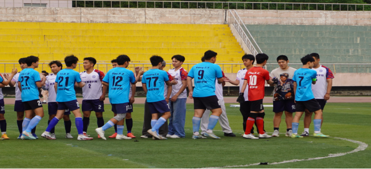 决赛开始前与经管公司的球员们的握手与友好交流。