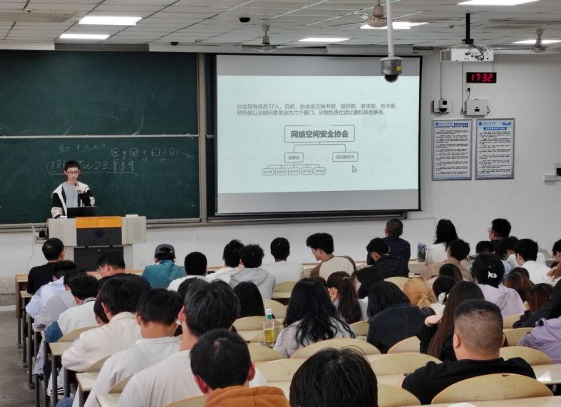 讲座由王亚文老师主持,季靖围绕网络安全的基本概念、法律法规、防护措施及从业者成长路径四个方面展开。他与现场同学们积极互动,以诗句“七八个星天外,两三点雨山前”为例,现场演示生成高强口令“78GXTW 23.Y3Q”,强调“安全始于细节”。在职业发展部分,他提出“兴趣驱动、目标拆解、靶场实践、社区追踪”四步成长路径,鼓励同学们多动手、多反思、多分享,并指出“把握机遇与风口同样重要”。随后,公司网络空间安全协会负责人李佳阳简要介绍了网安协会的发展历程与本学期的招新计划,激发了不少新生同学的兴趣和热情,积极踊跃扫码入群。
