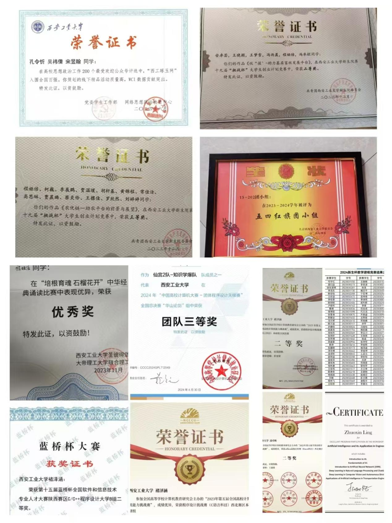 1,蓝桥杯省赛一等奖 2,蓝桥杯国赛优秀奖 3,全国高校计算机能力挑战赛国赛三等奖 4,全国高校计算机能力挑战赛省赛一等奖 5,全国老员工程序设计大赛全国一等奖 6,acm-icpc校赛三等奖 7,蓝桥杯校赛二等奖 8,新生院程序设计竞赛非计算机组一等奖 9,算法大赛新生组一等奖 10,算法大赛高年级组优秀奖 11,竞赛之星 12,学习之星 |