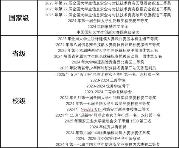 这份踏实,让张蜜蜜收获了不错的成绩,拿到了国家励志奖学金和校级二等学业奖学金,还获评“三好员工”。但最让她开心的不是分数,而是知识真正 “为她所用”—— 学《计算机网络》时梳理的逻辑,后来帮她在信息安全竞赛中快速理清攻防思路;物理实验课上积累的数据记录经验,成了她参加全国物理实验竞赛的 “底气”。她渐渐明白,勤勉的意义,不仅是拿到好成绩,更是让自己拥有解决实际问题的 “战斗力”。