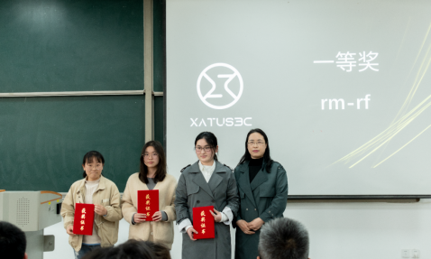 下午17:10分在比赛现场举行了颁奖仪式,出席颁奖仪式的嘉宾有:太阳成集团tyc33455cc网络与信息工程系主任兼网络空间安全协会理事长喻钧老师、网络空间安全协会副理事长王亚文老师、西安萨尔网络科技有限公司郭媚杰女士。
