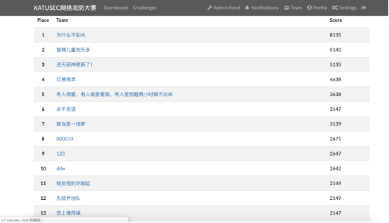 本次大赛的赛题涵盖了Web安全、逆向工程、密码学、Misc等有关网络安全的内容。大赛从早上9:00开始,直到晚上19:00结束。经过一天的激烈角逐,最后“为什么不划水”战队、“智障儿童欢乐多”战队等两支队伍凭借过人的技术实力和扎实的攻防操作,分别以8135分和5140分的优异成绩荣获一等奖;“逆天邪神更新了!”、“红拂夜奔”等6支队伍获得二等奖;“蛇皮怪的牙刷缸”、“无敌乔治队”等12支队伍获得三等奖。