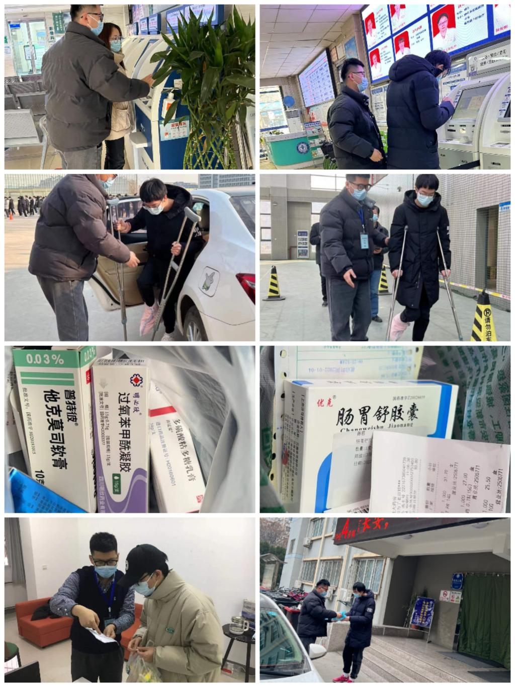 为做好疫情期间员工看病的保障工作,太阳成集团tyc33455cc辅导员在疫情期间为员工暖心护航。辅导员呼延晓蓉在12月24日、26日带20级软件工程专业员工李琳去城北医院就医、并赴张家堡社区卫生服务中心带员工打疫苗;辅导员孙君在1月4日、1月5日连续两天开车护送20级软件工程专业员工王鑫、18级网络工程专业员工杨甲栋外出就医,协助员工办理挂号手续,完成问诊后安全送员工回校;同时还为20级软件工程专业员工农积臻购买治疗皮肤病类的药品。在送药品时,孙老师也不忘为员工悉心讲解用药方式和剂量,提醒员工遵照医嘱服药,定期汇报病情。在组织员工进行核酸检测中,孙老师还专门为因伤行动不便的员工提供车接车送的帮助,受到了师生们的一致好评。他说道,“在公司,我们就是员工们的家长,我们不照顾好自己的员工,谁来照顾。”