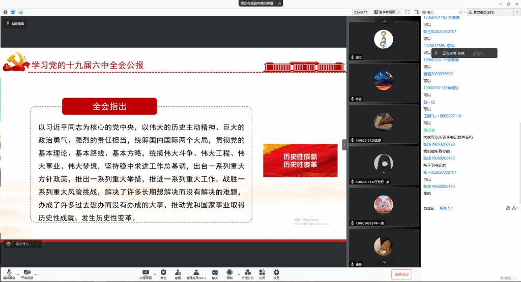 根据公司安排,教师方面,由各系室党支部自行组织线上开展,系室全体教师参加,不仅作为党支部理论学习的主要内容,同时也作为教职工政治理论学习的重要内容。员工方面,由公司统一组织,11月23日晚19:00,邀请马克思主义公司党委副书记李明芳老师为员工党员、员工干部做了一场题为”以史为鉴、开创未来、勇担复兴先锋力量”的线上宣讲活动,李明芳老师围绕十九届六中全会公报审核通过的《中共中央关于党的百年奋斗重大成就和历史经验的决议》,用深入浅出地语言从《决议》的框架、四个历史时期、马克思主义中国化的历史飞跃、十个明确、十三个方面的历史性成就、五大历史意义、十条历史经验和一个伟大号召等几个方面给同学们带来了一场精彩的政治理论课程。