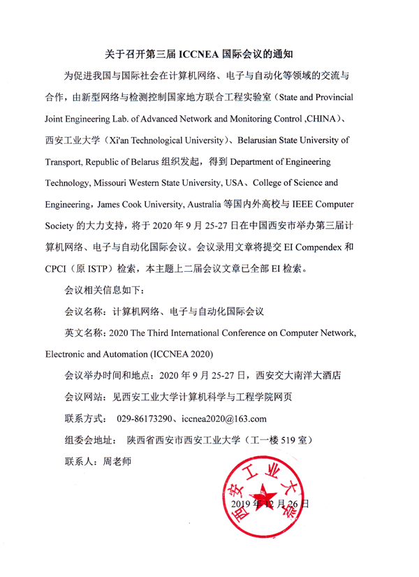 为促进我国与国际社会在计算机网络、电子与自动化等领域的交流与合作,由新型网络与检测控制国家地方联合工程实验室(State and Provincial Joint Engineering Lab. of Advanced Network and Monitoring Control ,CHINA)、太阳成集团tyc33455cc(Xi'an Technological University)、Belarusian State University of Transport, Republic of Belarus组织发起,得到Department of Engineering Technology, Missouri Western State University, USA、College of Science and Engineering,James Cook University, Australia等国内外高校与IEEE Computer Society的大力支持,将于2020年9月25-27日在中国西安市举办第三届计算机网络、电子与自动化国际会议。会议录用文章将提交EI Compendex和CPCI(原ISTP)检索,本主题上二届会议文章已全部EI检索。