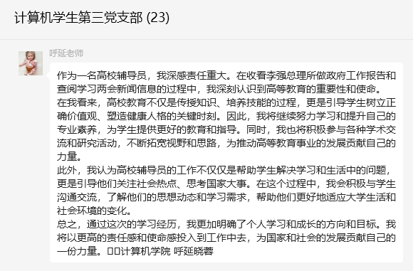 在交流环节中,每位党员都畅所欲言,分享了自己对两会精神的理解和感悟。支部书记呼延晓蓉同志提到,身为一名高校辅导员,自身工作不仅仅是帮助员工解决学习和生活中的问题,更是引导他们关注社会热点、思考国家大事。在这个过程中,积极与员工沟通交流,了解他们的思想动态和学习需求,帮助他们更好地适应老员工活和社会环境的变化。