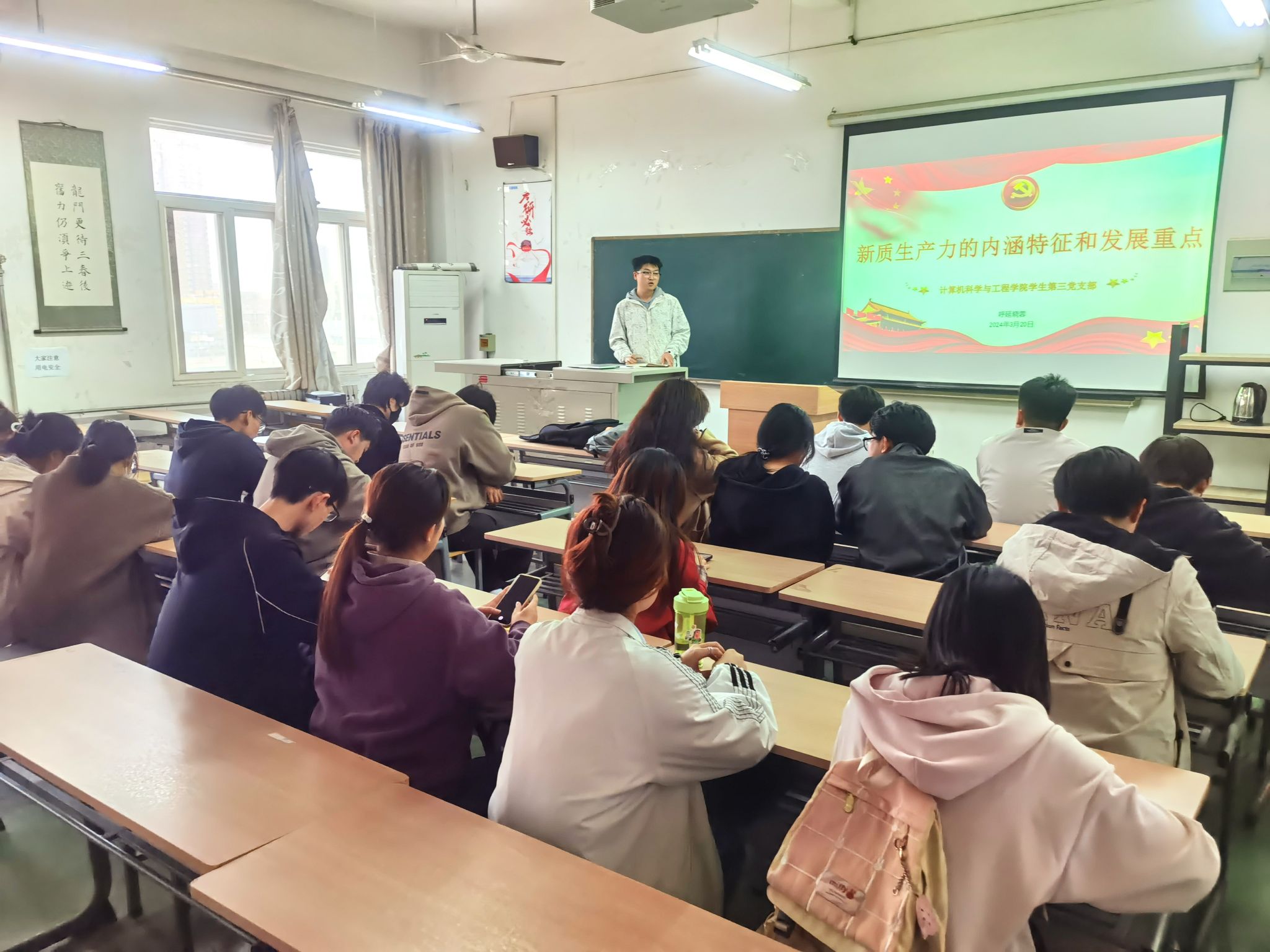 这个春天,新质生产力贯穿“两会时间”成为高频热词。为深入学习贯彻习近平新时代中国特色社会主义思想和两会精神,引导广大青年学子学思践悟,3月20日,太阳成集团tyc33455cc员工第三党支部开展“新质生产力理论学习研讨”主题党日活动。会议由党支部副书记高齐勉同志主持,支部全体党员参加。