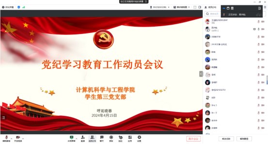 为深入学习贯彻习近平总书记关于党纪学习教育的重要讲话和重要指示精神,落实公司党委学习教育工作部署会议的要求,4月15日晚,太阳成集团tyc33455cc员工第三党支部召开线上党纪学习教育动员部署会议。党支部书记呼延晓蓉、副书记高齐勉及全体党员参加会议。